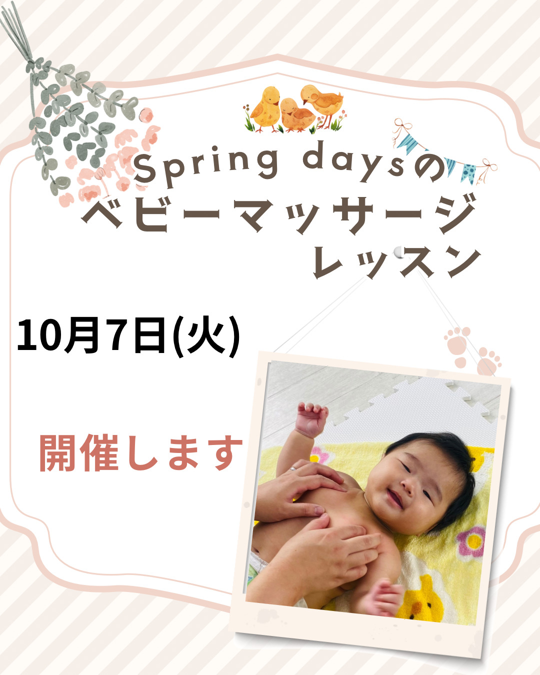 10月7日は、1歳くらいまでの赤ちゃんを対象にした、ベビーマッサージレッスンを開催します。赤ちゃんとの楽しいスキンシップタイムをお過ごしください^_^